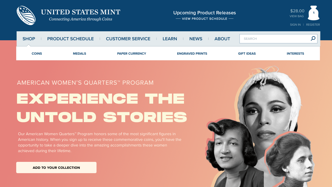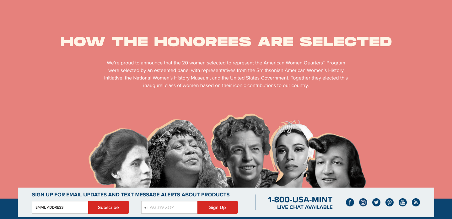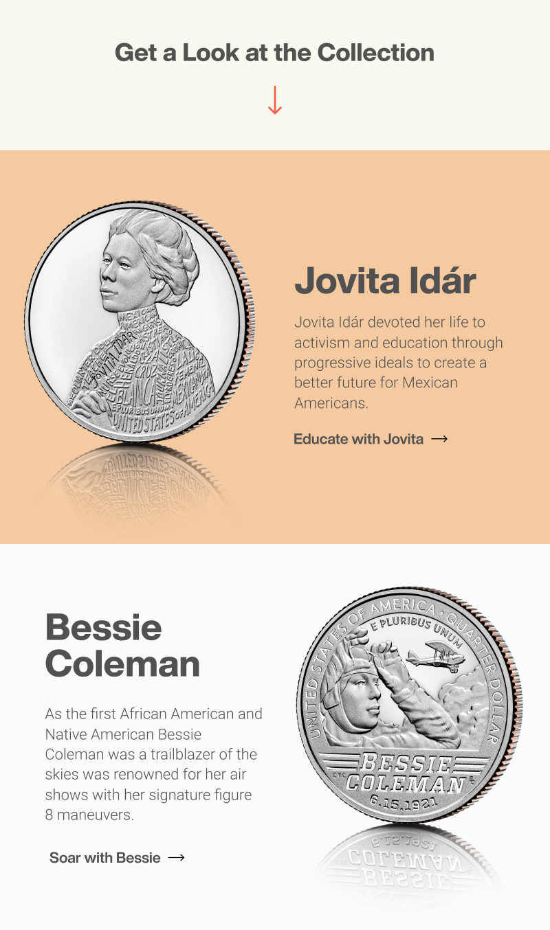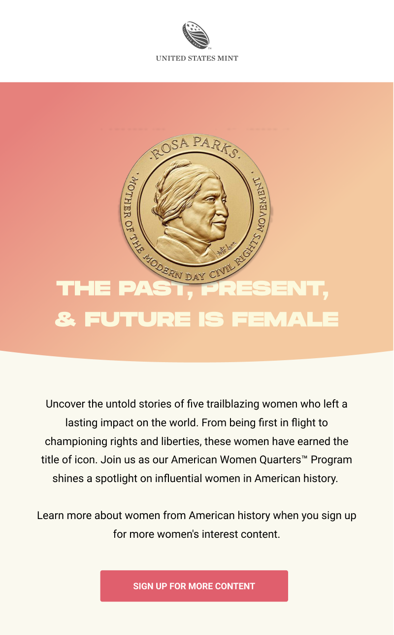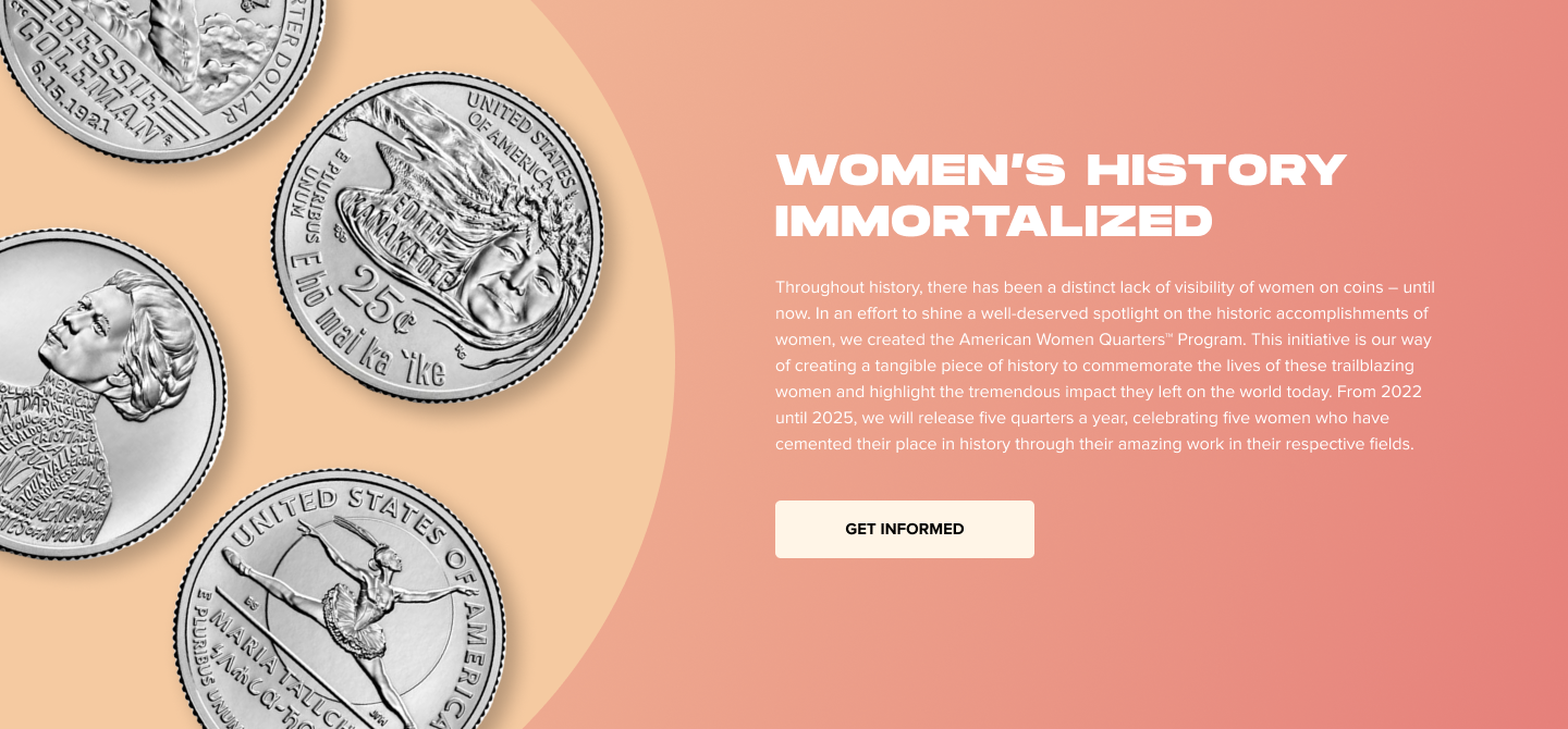 The Solution:We reframed collecting as something accessible, engaging, and culturally meaningful. By spotlighting the limited-edition American Women’s Quarters, the work shifted away from overly formal language in favor of a warmer, more conversational tone. Lighter copy, brighter visuals, and surprising historical details helped position the program not just as a purchase, but as an invitation to participate in a living piece of history.