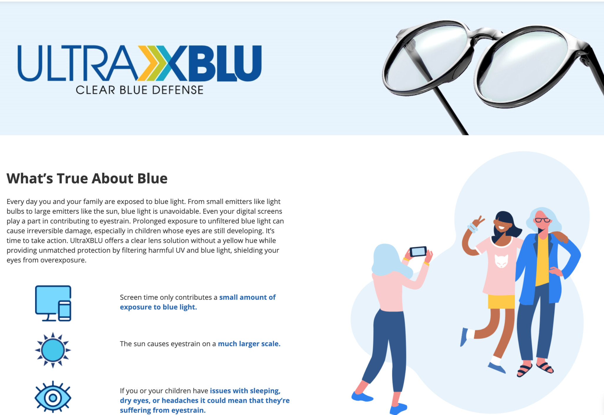 The Solution:I helped translate a technical concept into something approachable and relevant. Through clear, benefit-led copy and visually engaging storytelling, the page explains what blue light is, where it shows up in everyday life, and how UltraXBlu lenses help reduce its impact—without overwhelming or talking down to the customer.